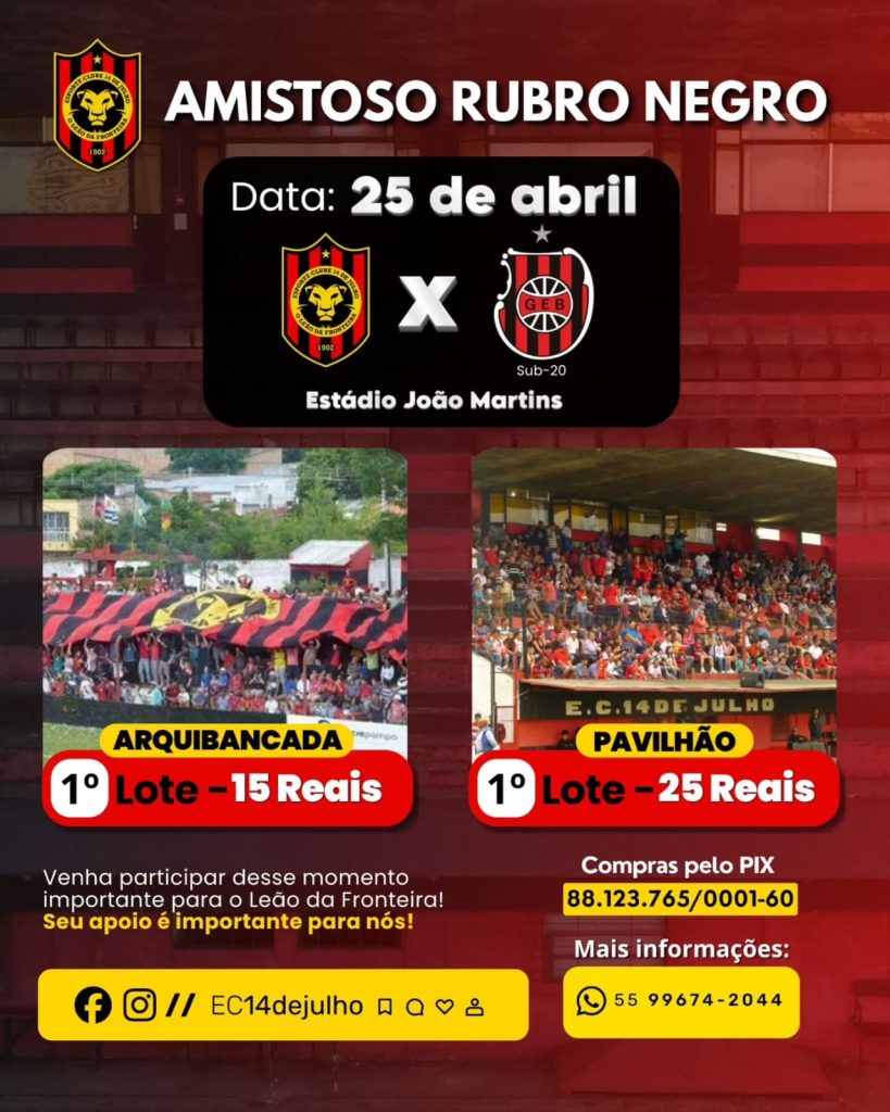 Apesar do cancelamento, a expectativa do torcedor segue em alta. Um novo compromisso do rubro-negro já está confirmado: no próximo dia 25 de abril, às 16h, no Estádio João Martins, o 14 de Julho entra em campo para enfrentar a equipe Sub-20 do Grêmio Esportivo Brasil de Pelotas, tradicionalmente conhecido como Xavante.