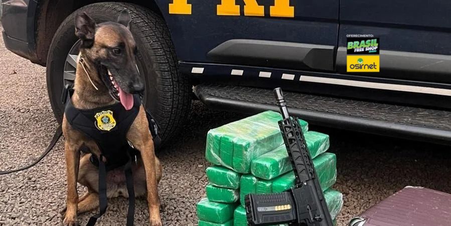 O animal indicou sinal positivo para entorpecentes quando farejaram a mala que pertencia a uma adolescente. Dentro da bagagem, além de 20 quilos de maconha, também foi localizado um fuzil calibre 5.556, dois carregadores e mais de 50 munições.