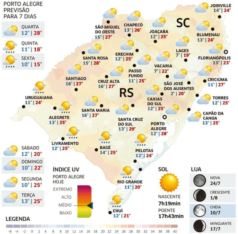 Porto Alegre e Caxias do Sul terão mínima de 12ºC e máximas de 28ºC e 25ºC, respectivamente. Ausentes deve ter marcas entre 2ºC e 20ºC e Vacaria entre 7ºC e 22ºC. Já em Santa Cruz, os termômetros devem ter registros de 13ºC a 29ºC.