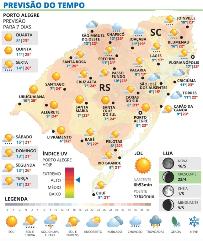 Com a massa de ar frio se afastando gradualmente, as temperaturas se elevam acentuadamente após mais um amanhecer de frio intenso, com geada em parte do território: máximas sobem em relação à véspera e ficam entre 20°C e 25°C na maior parte do estado gaúcho.