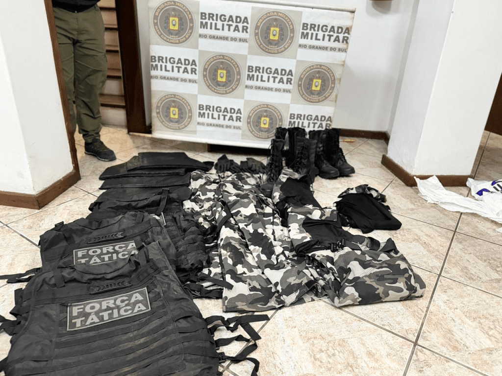 No local, os policiais apreenderam uma grande quantidade de materiais, chamando a atenção pelo uso de itens semelhantes aos da própria Brigada Militar. Entre os objetos estavam três coletes balísticos com identificação da Força Tática, fardamentos camuflados, coturnos, luvas e duas balaclavas, além de outros acessórios utilizados em operações.