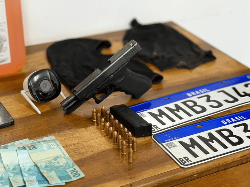 Também foram localizados uma pistola, munições, carregador, dinheiro em espécie, uma câmera de segurança, um recipiente com gasolina e um aparelho celular.