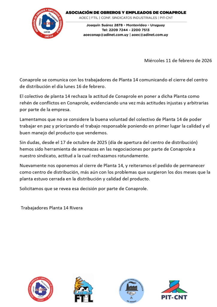 “El colectivo de planta 14 rechaza la actitud de Conaprole en poner a dicha planta como rehén de conflictos de Conaprole, evidenciando una vez más actitudes injustas y arbitrarias por parte de la empresa”, afirman los trabajadores de Rivera.