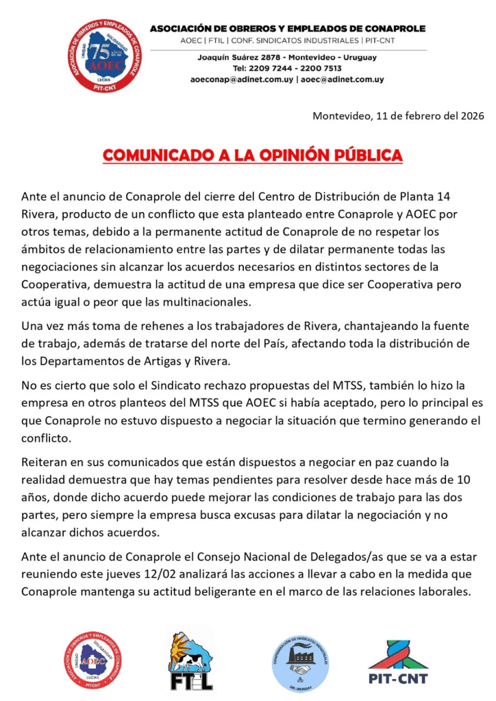 Los trabajadores del Centro de Distribución de Rivera y la Asociación de Obreros y Empleados de Conaprole (AOEC) emitieron sendos comunicados este miércoles luego del anuncio de la empresa de proceder al cierre definitivo de la planta tras nueve meses de conflictividad sindical sostenida.