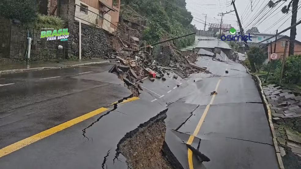 Uma rua em Gramado, na Região da Serra, desmoronou no final de semana após a chuva que atingiu a cidade. Moradores precisaram sair de casa por causa do risco à segurança deles.